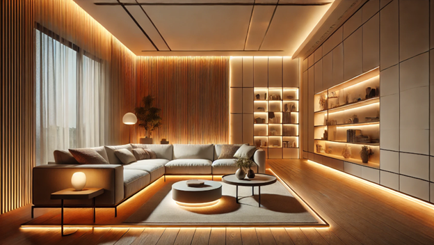 Here is an image of a modern interior with LED strips providing soft, indirect lighting along the ceiling edges and furniture. The warm glow enhances the ambiance of the space.