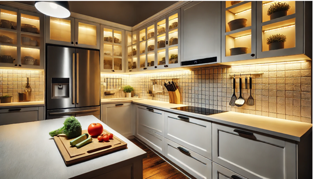 • Task Lighting: Use adhesive LED strips under cabinets to illuminate counters and improve visibility while cooking.