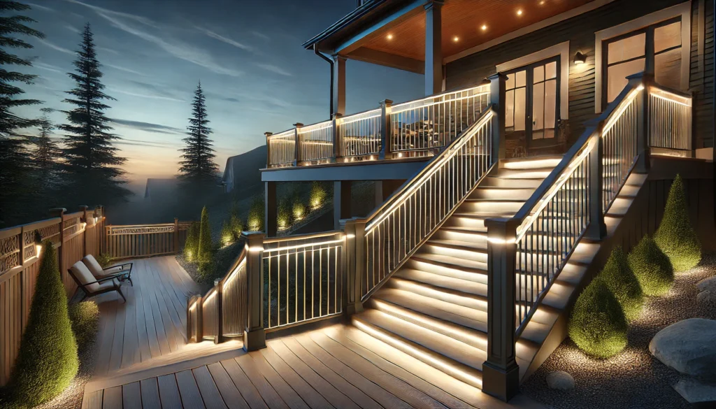 LED strip lights or individual lamps can be installed under stair treads and deck railings for a sleek, modern look. These lights enhance safety while adding a subtle glow that elevates the overall design.