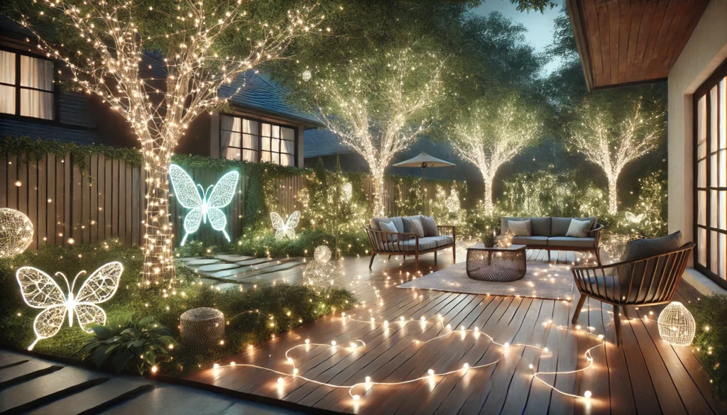 - Wrap LED fairy lights around pergolas, fences, or tree trunks for a mystical atmosphere.